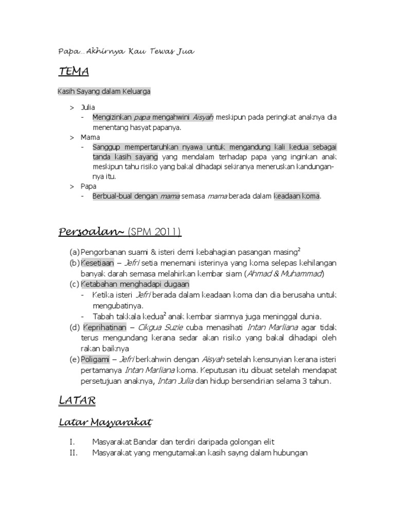 Novel Papa Akhirnya Kau Tewas Jua Tema Persoalan Watak Perwatakan