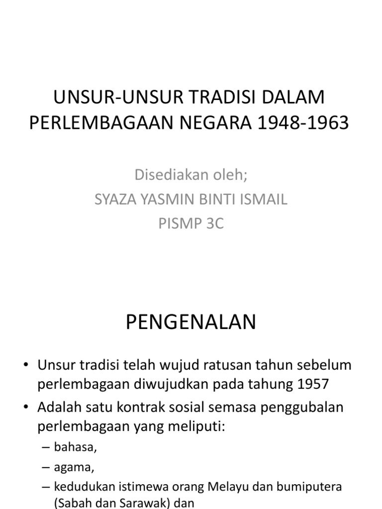 Unsur Unsur Tradisi Dalam Perlembagaan Negara 1948 1963 Disediakan Oleh Syaza Yasmin Binti Ismail Pismp 3c