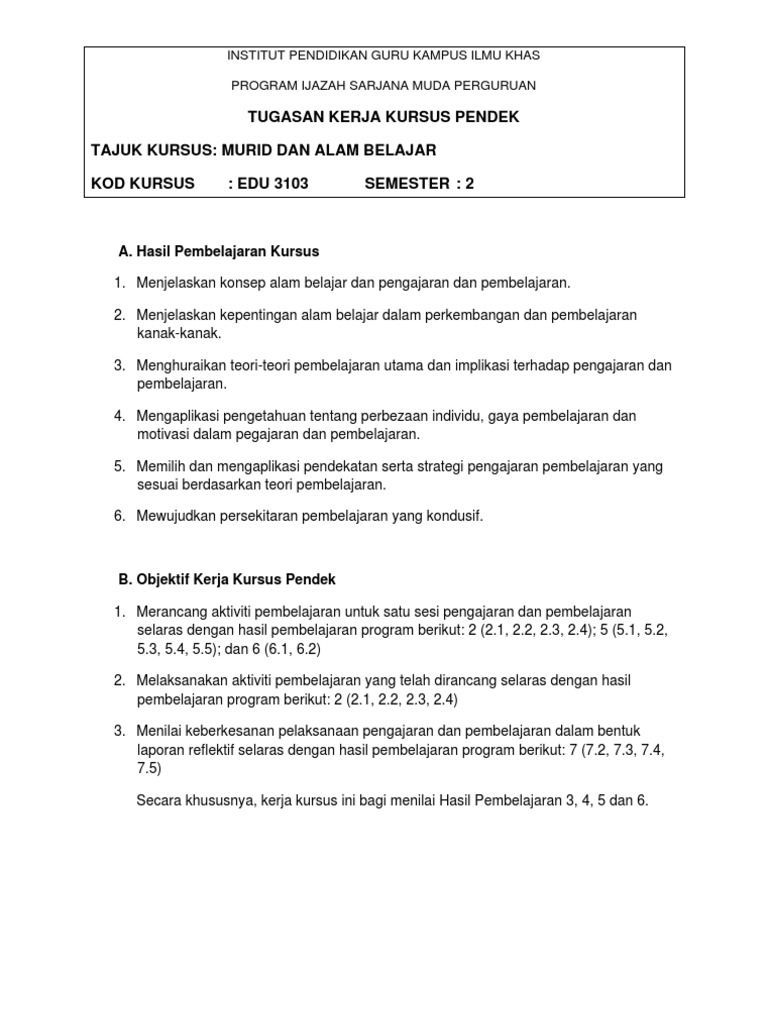 Tugasan Kerja Kursus Pendek Tajuk Kursus Murid Dan Alam Belajar Kod Kursus Edu 3103 Semester 2