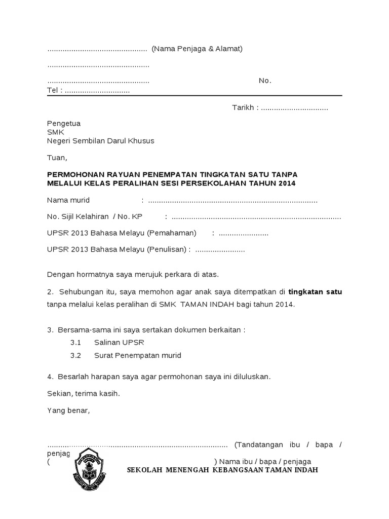 Borang Permohonan Tanpa Peralihan Dan Surat Kelulusan Oleh Sekolah 1