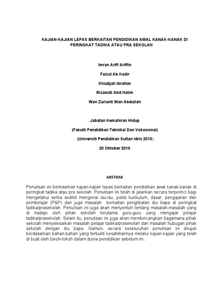 Kajian Kajian Lepas Berkaitan Pendidikan Awal Kanak Kanak Di Peringkat Tadika Atau Pra Sekolah