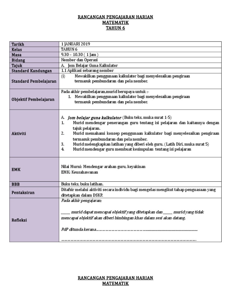 Contoh Rph Matematik Tahun 6 Cute766