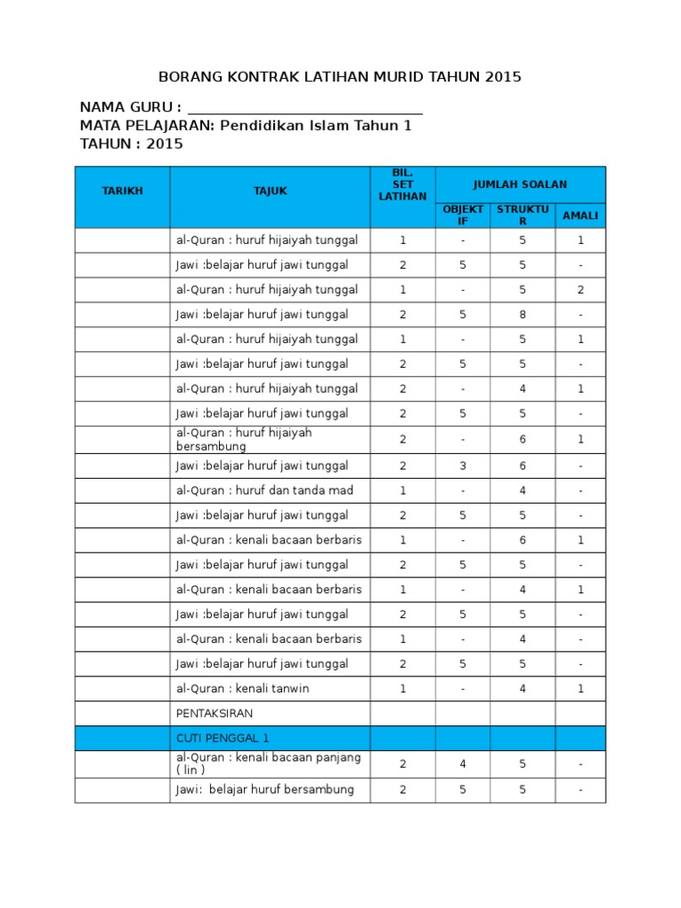 Contoh Kontrak Latihan Murid Pendidikan Islam Tahun 1