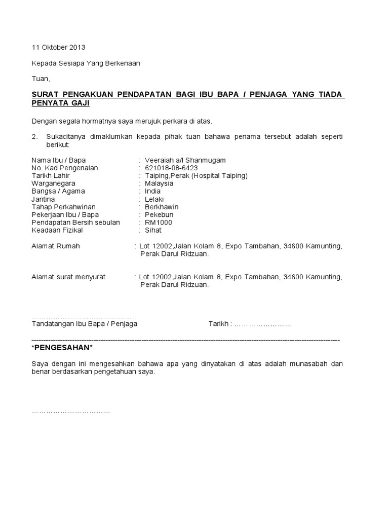 Surat Pengesahan Pendapatan Ibu Bapa Tanpa Slip Gaji Pdf