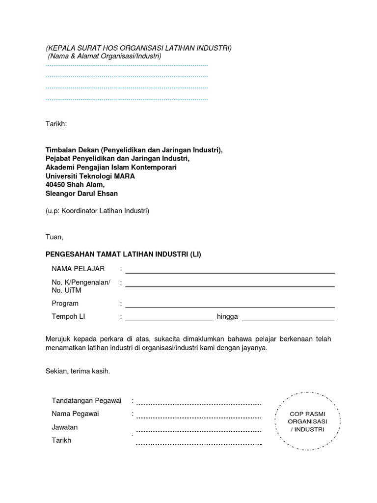 Contoh Surat Akuan Latihan Industri