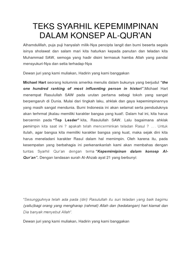 Doc Teks Syarhil Qur An Kepemimpinan Dalam Islam Kepemimpinan Dalam Konsep Islam Nesly Aristi Academia Edu